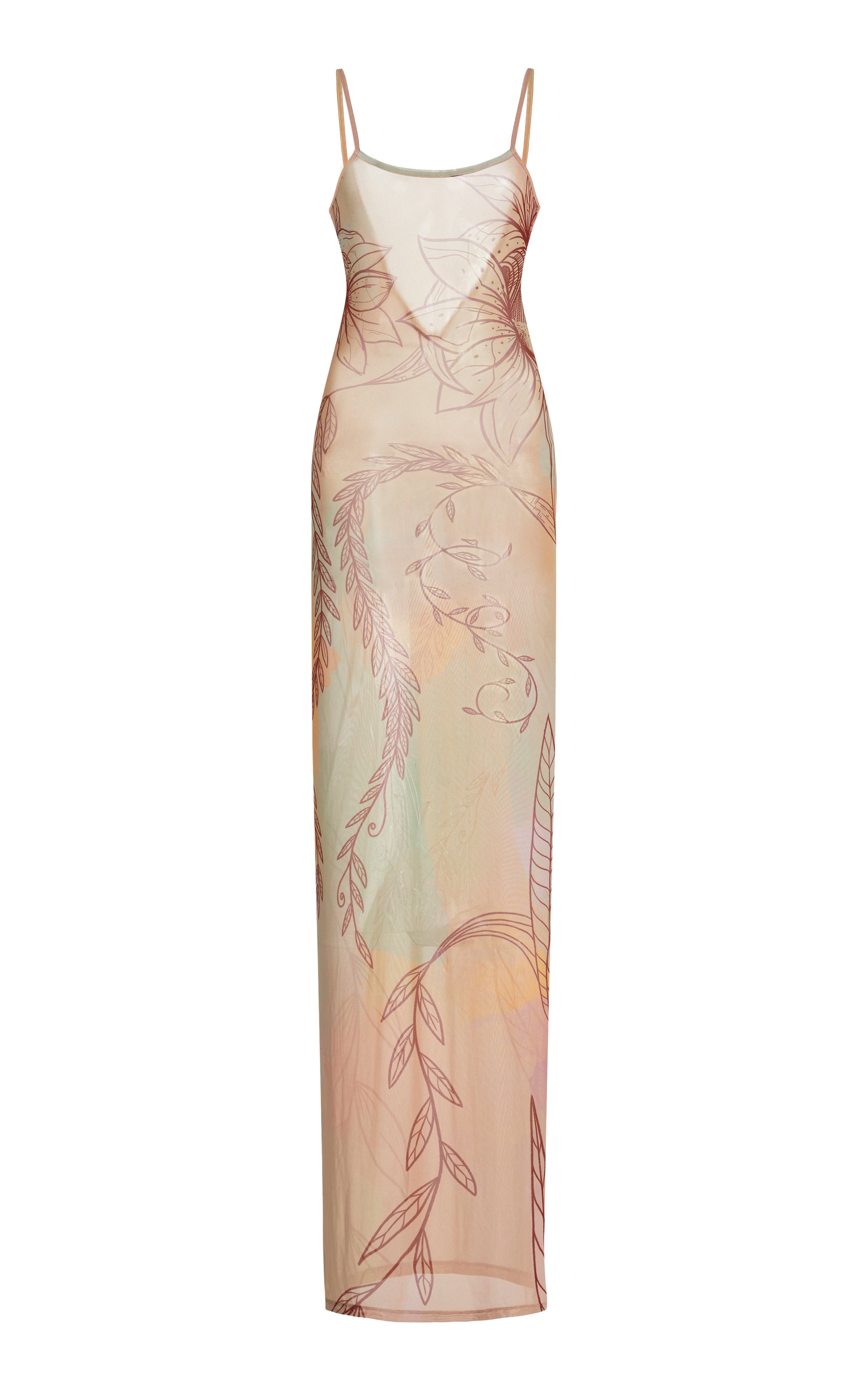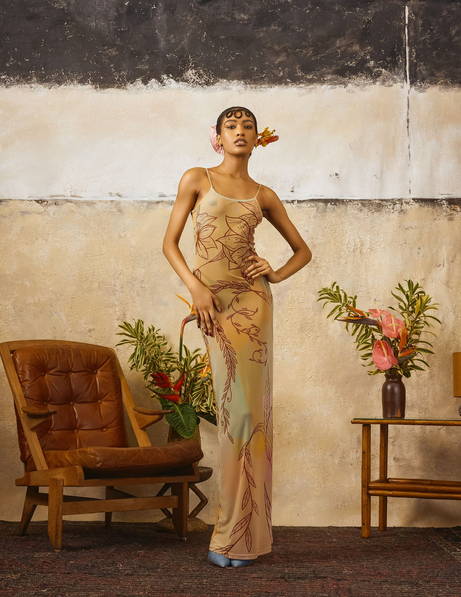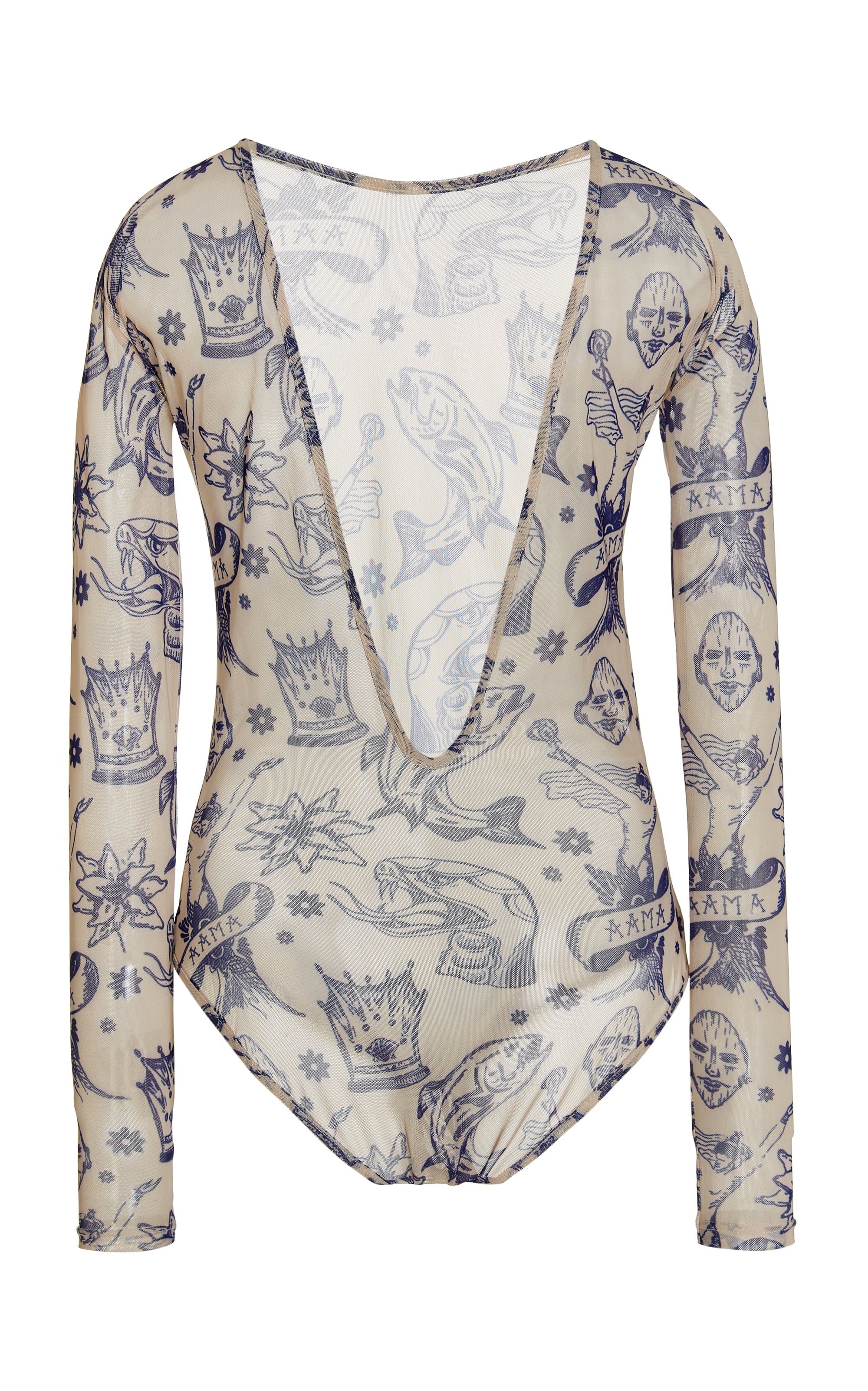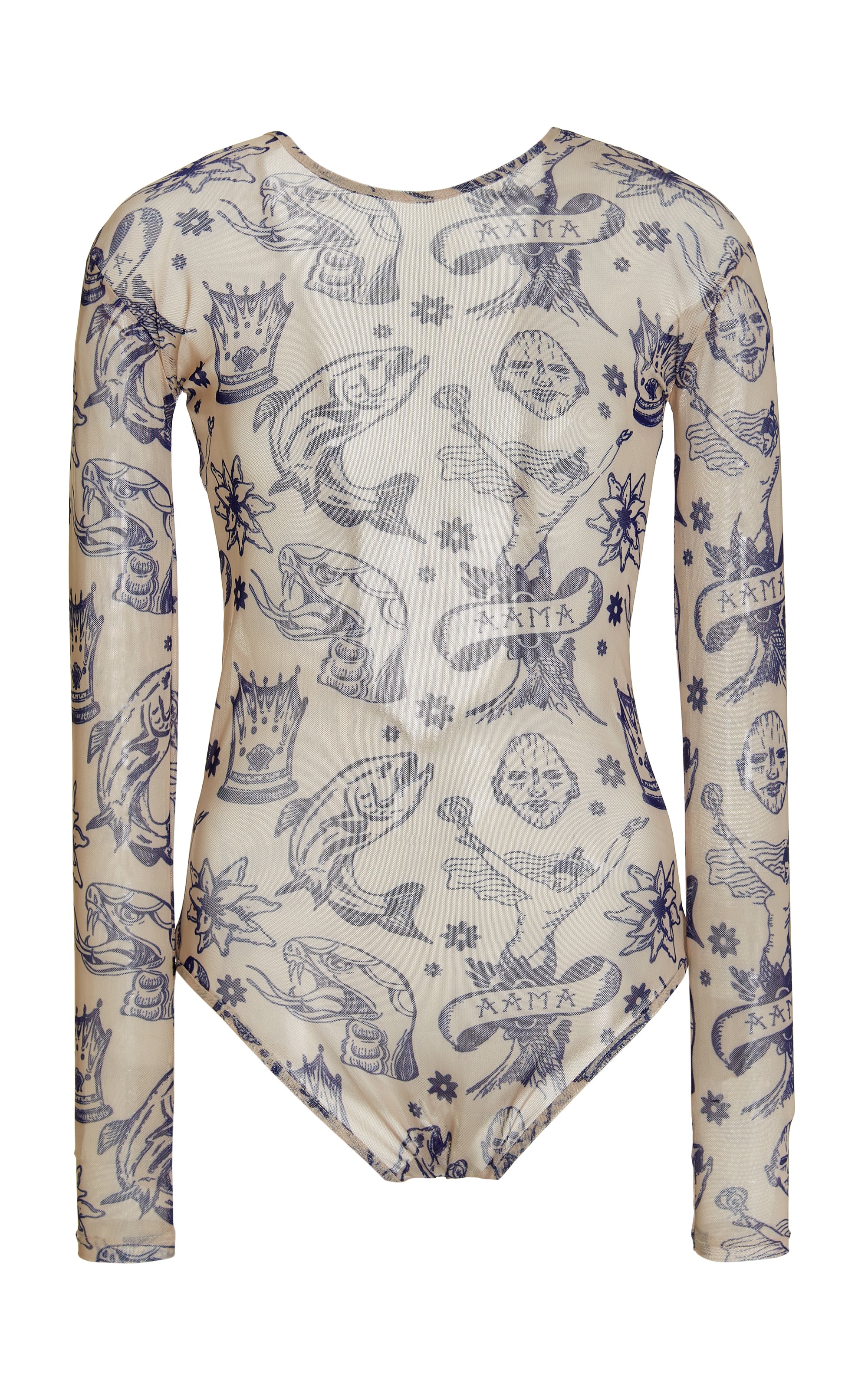House of Aama Original La Siréne Print, Flesh Toned Power Mesh Material. Flower design on sleeve at wrist. Due to the unique printing method of this design, colors and patterns may vary slightly.
