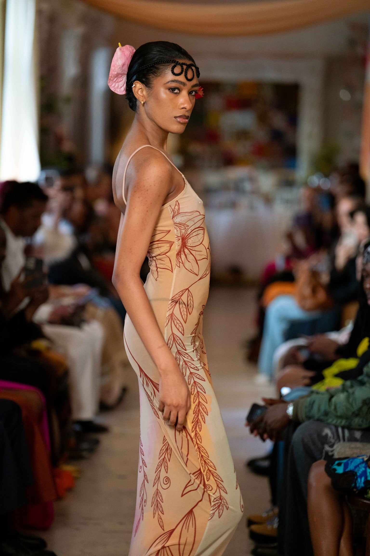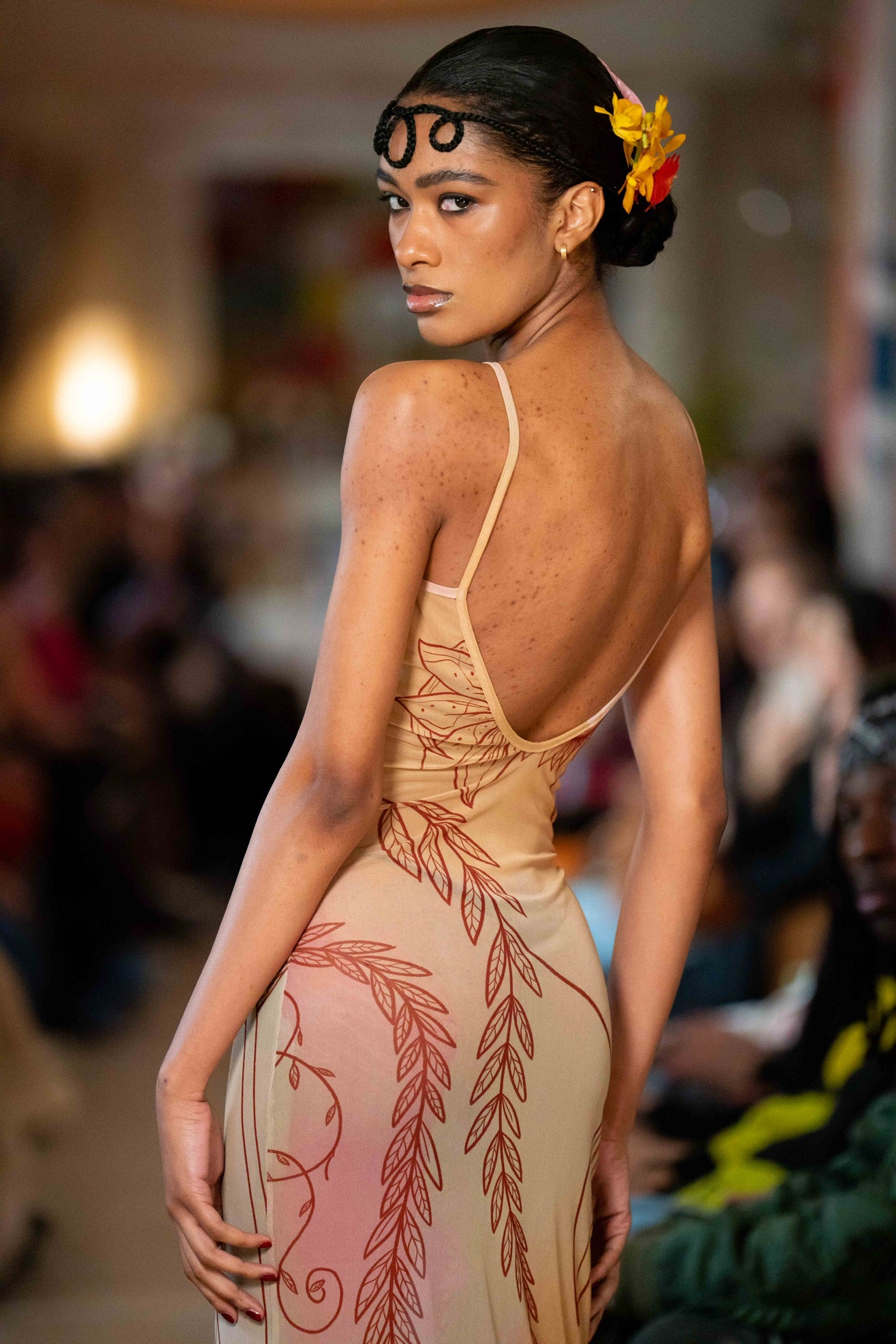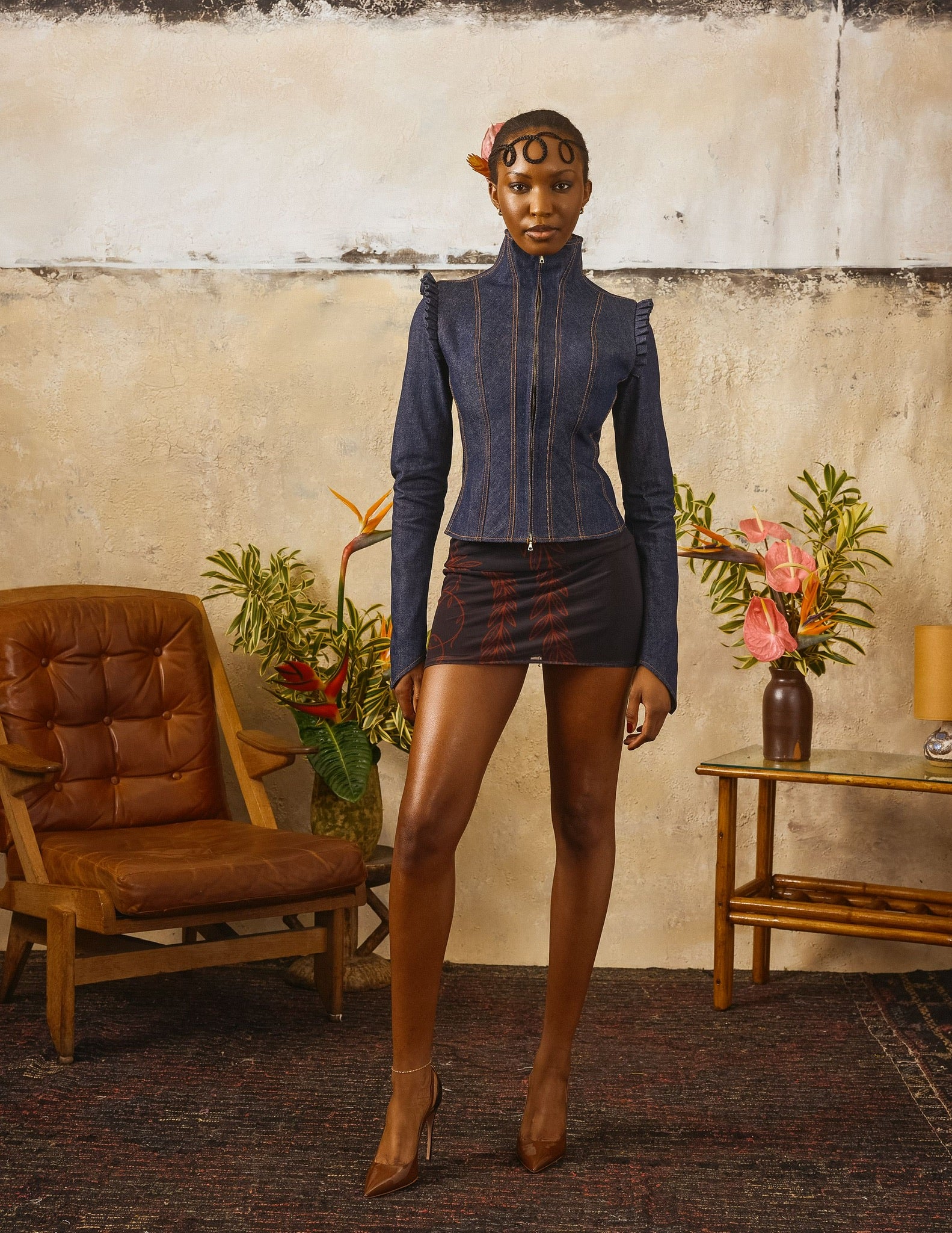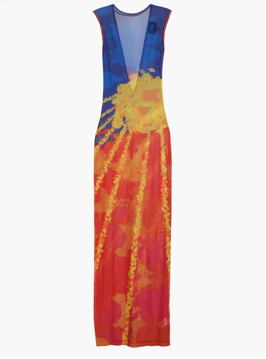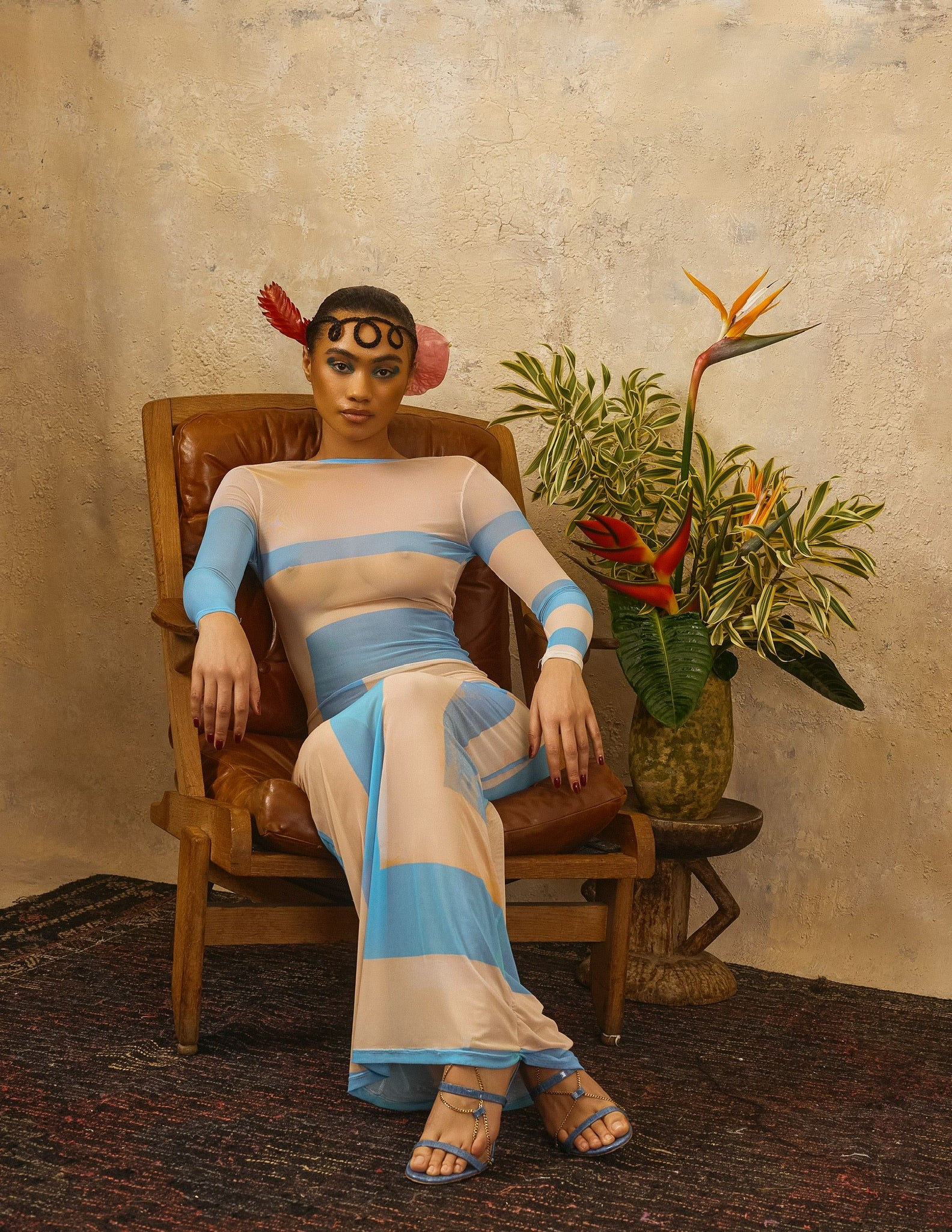 House of Aama Original La Siréne Print, Flesh Toned Power Mesh Material. Flower design on sleeve at wrist. Due to the unique printing method of this design, colors and patterns may vary slightly.